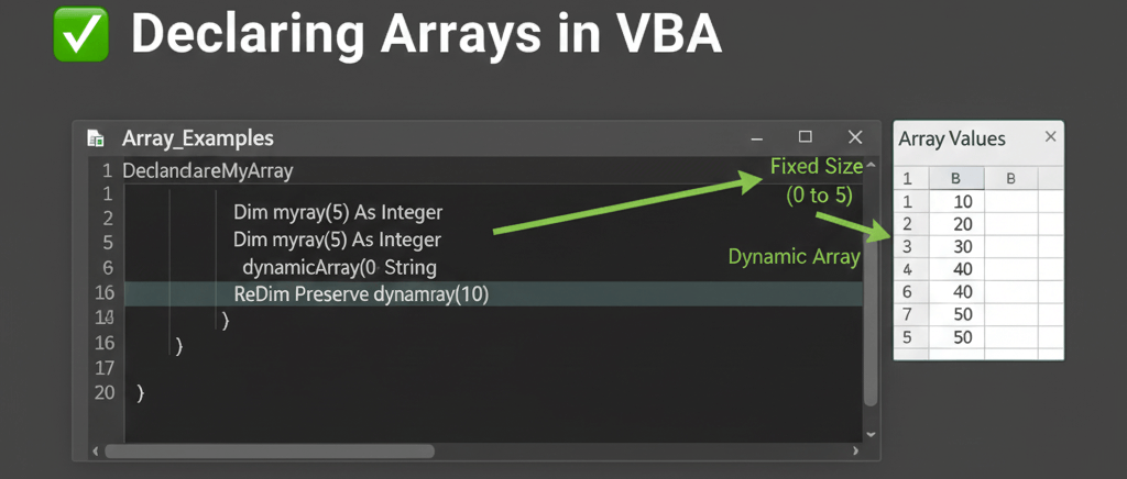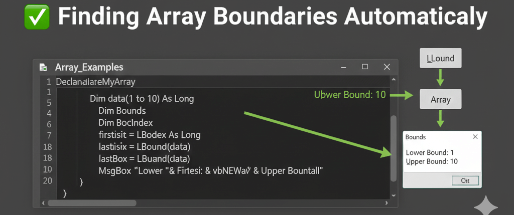 LBoundandUBoundfor flexible iteration. - Work with multidimensional arrays for table-like data.